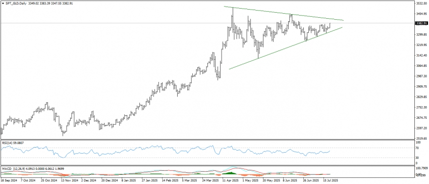 مازال المثلث المتماثل يحكم حركة الذهب هبوطا وصعود وارتد الذهب لثلاث مرات من الحد السفلى للمثلث ويتجه الان الى الحد الاعلى والذى من المرجع ان يلتقيه عند مستويات 3410- 3415